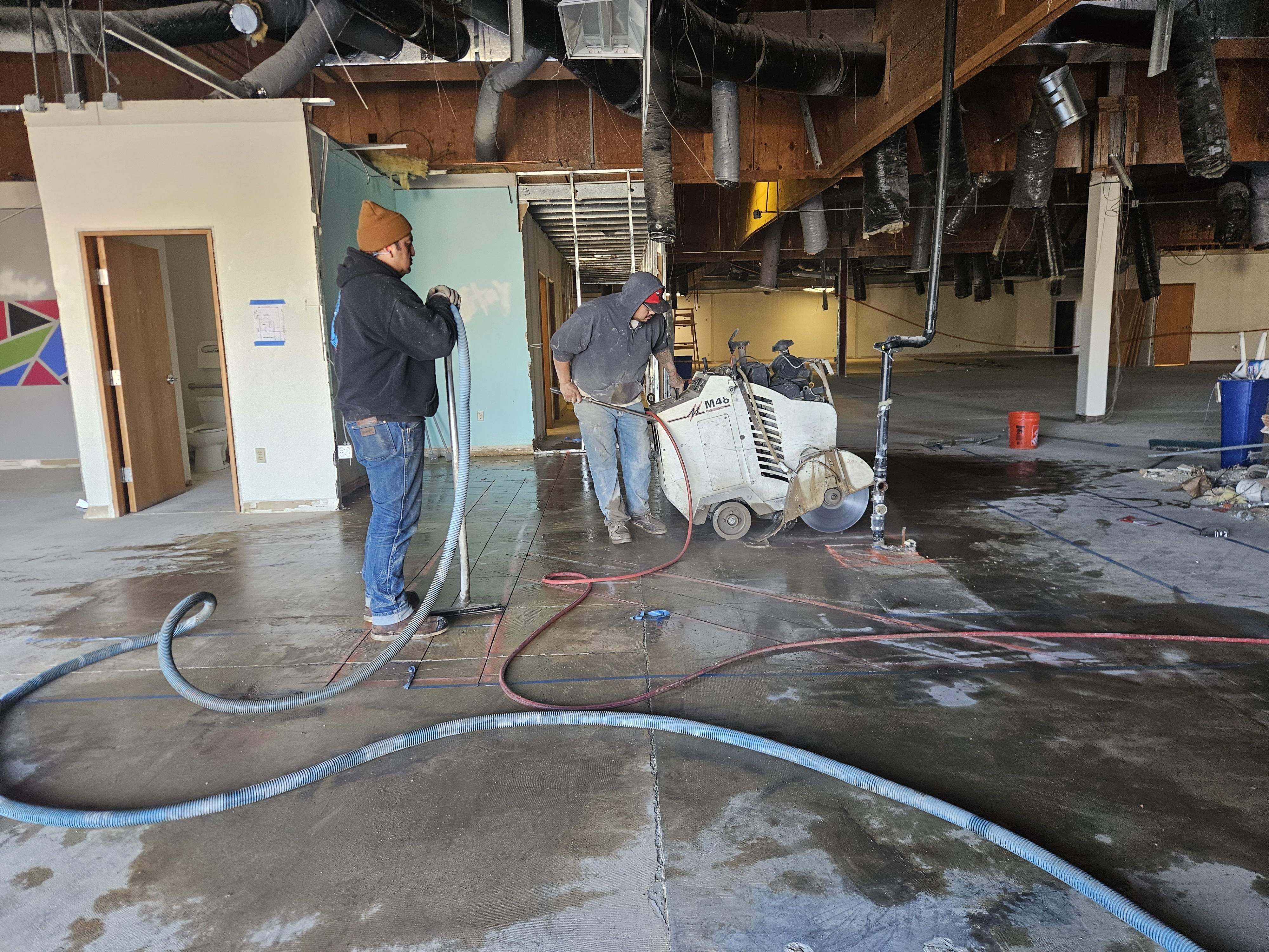 After marking out where all the equipment will go, we got the concrete cut for the plumbing on February 25th. The next step will be having the plumbing ran for all the kitchen equipment.
